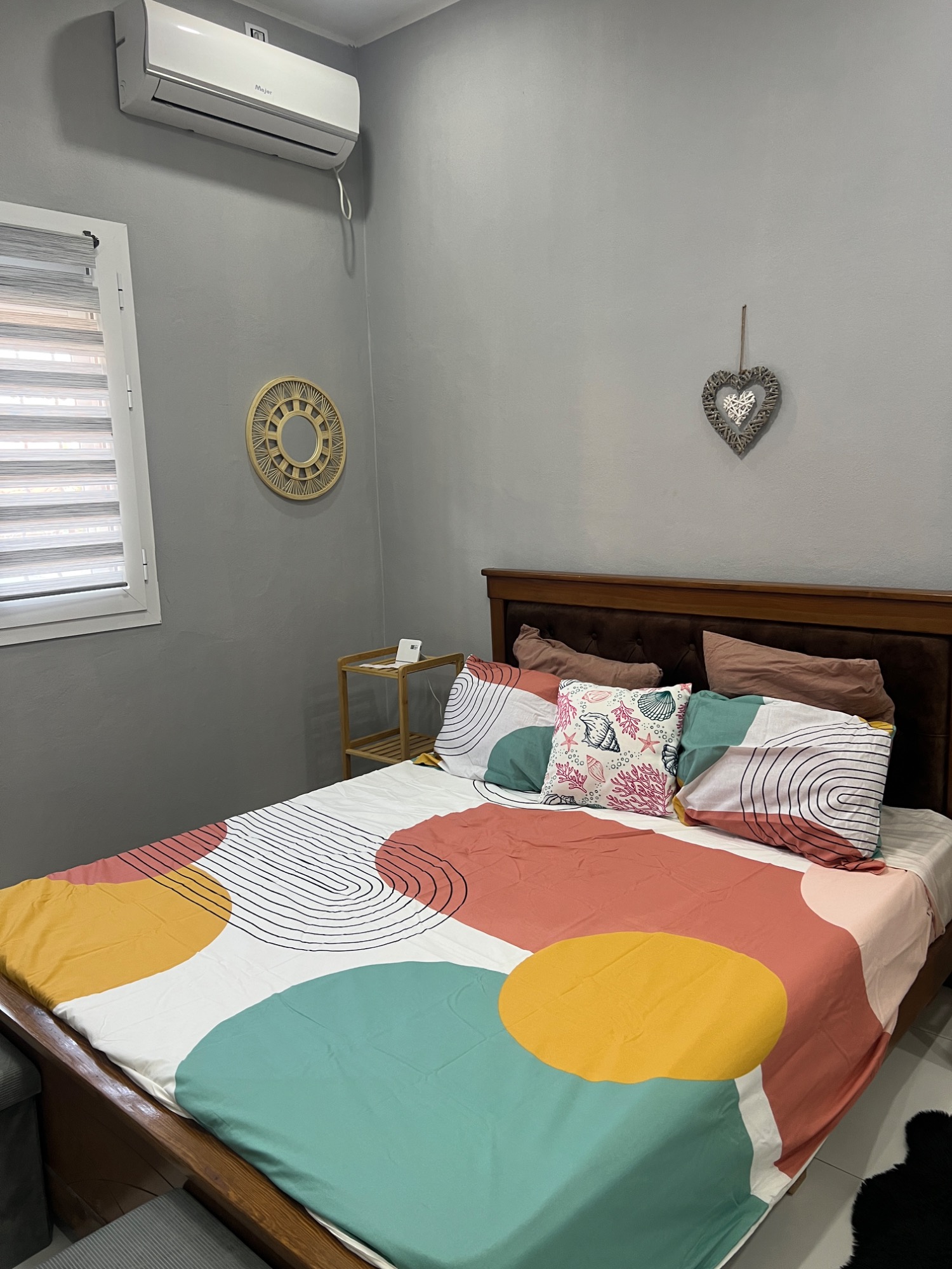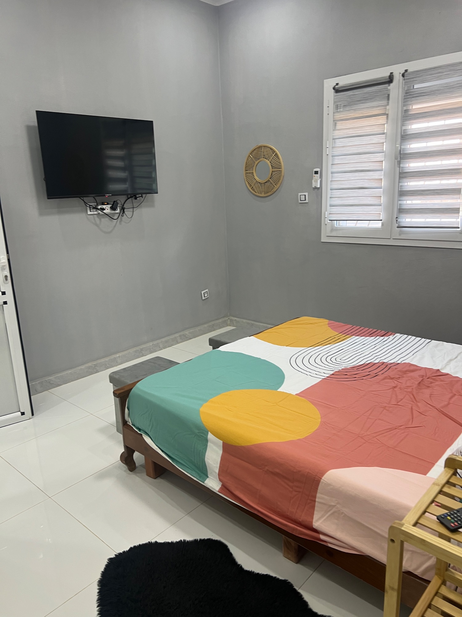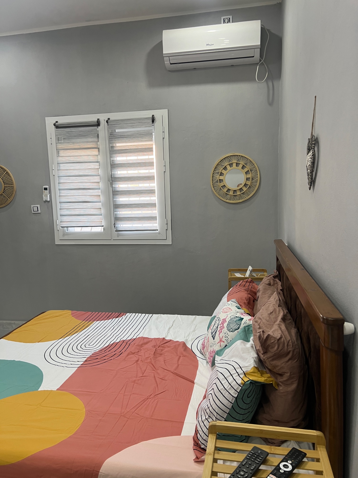 La chambre parentale offre un espace spacieux et confortable, idéale pour se détendre après une longue journée à la plage. Équipée d'une télévision diffusant des chaînes arabes, elle permet de profiter de vos programmes préférés tout en étant chez soi. La fenêtre donnant sur la cour apporte lumière naturelle et une vue agréable, créant une ambiance apaisante.