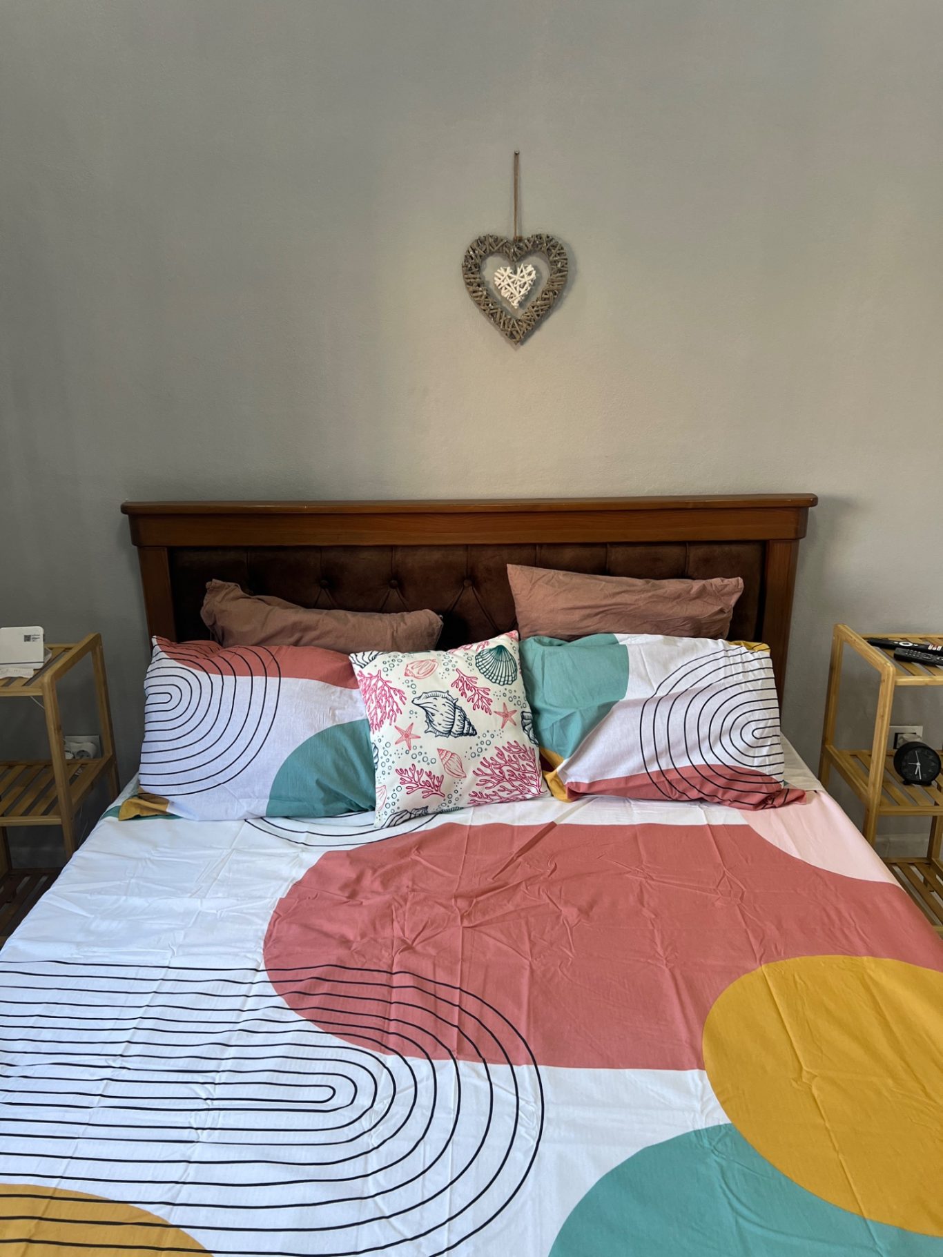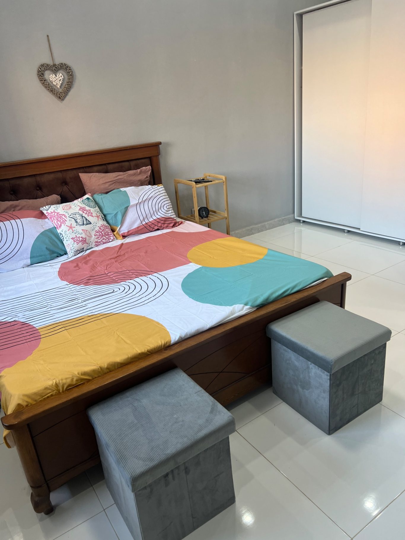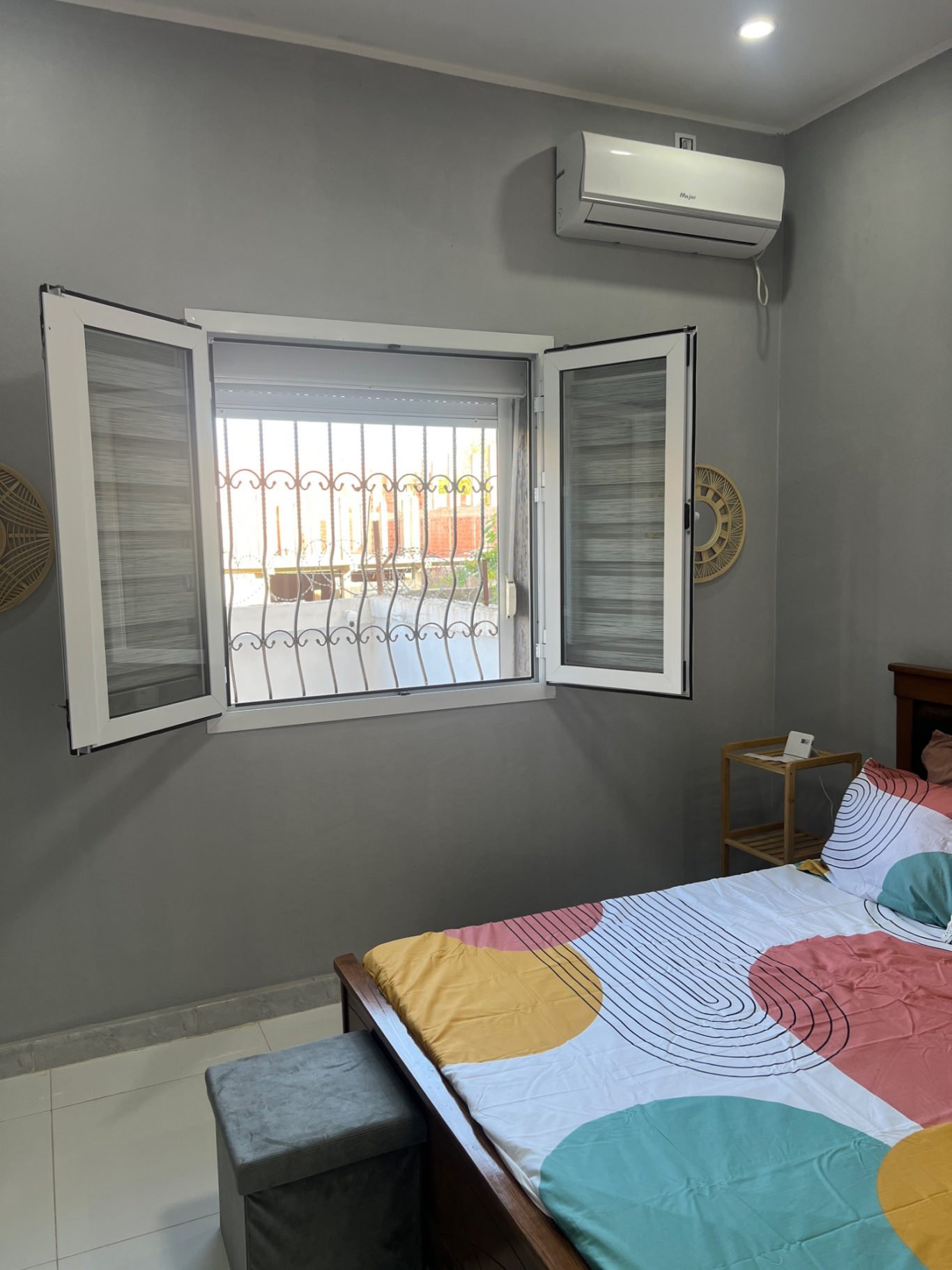 La chambre parentale offre un espace spacieux et confortable, idéale pour se détendre après une longue journée à la plage. Équipée d'une télévision diffusant des chaînes arabes, elle permet de profiter de vos programmes préférés tout en étant chez soi. La fenêtre donnant sur la cour apporte lumière naturelle et une vue agréable, créant une ambiance apaisante.