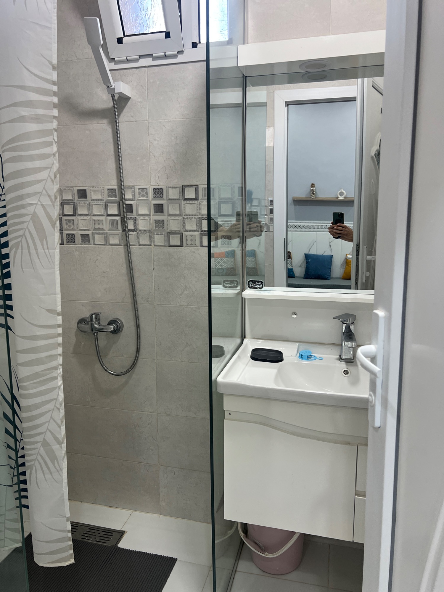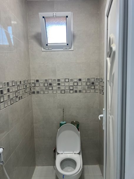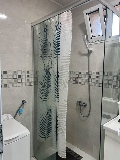 Dans cet appartement, la douche italienne est soigneusement séparée des toilettes, offrant ainsi un espace de bien-être distinct. Vous y découvrirez une machine à laver de la marque Brandt, idéal pour faciliter vos tâches quotidiennes. Le meuble aménagé permet de déposer vos produits de douche en toute simplicité, tout en optimisant le rangement. De plus, l'eau chaude est disponible 24h/24, garantissant un confort optimal à tout moment de la journée.